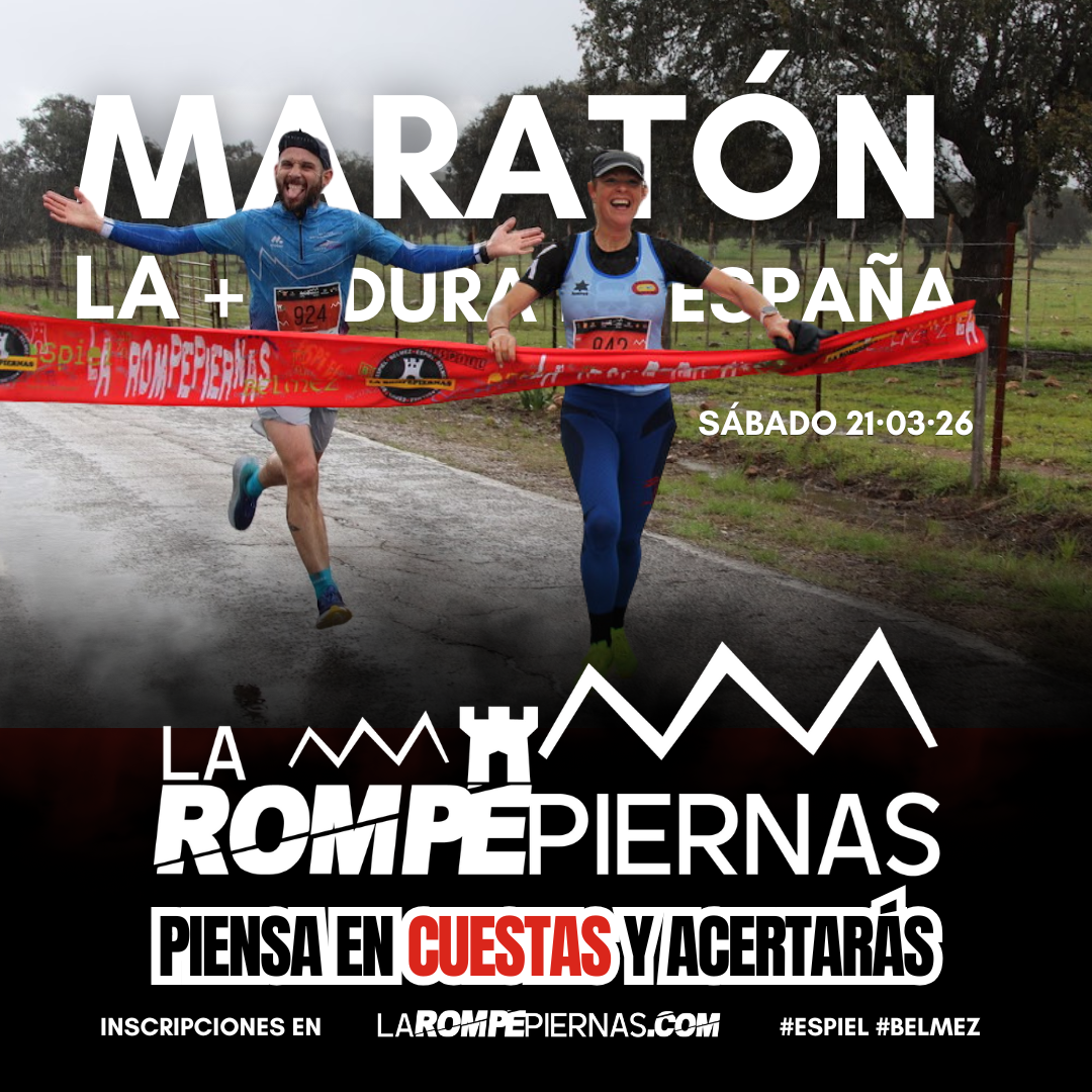 La Rompepiernas Belmez-Espiel 2026 💪🏻 MARATÓN - La más dura de España 💥 En sus 42.8 kilómetros tus piernas desafiarán más de 600 metros de desnivel de continuos sube-bajas por la carretera que une las dos localidades rodeadas de las sierras y dehesas del Valle del Guadiato. 📍 Salida y meta en Espiel con paso intermedio por Belmez 📆 Sábado 21 de marzo 2026 📝 Inscripciones en https://larompepiernas.com PIENSA EN CUESTAS Y ACERTARÁS Ayuntamiento De Espiel Ayuntamiento de Belmez Mancomunidad de Municipios Valle del Guadiato Diputación de Córdoba Atletismo La Rompepiernas Atletismo Espiel Espiel #LaRompepiernas #Belmez #Espiel #Running #ValleDelGuadiato #Guadiato #Carreras #Maraton #MediaMaraton #Senderismo